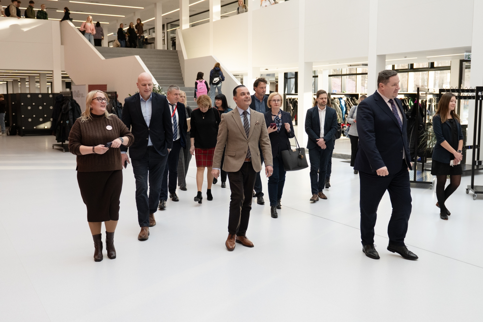Tikšanās dalībnieki iet pa ģimnāzijas foajē