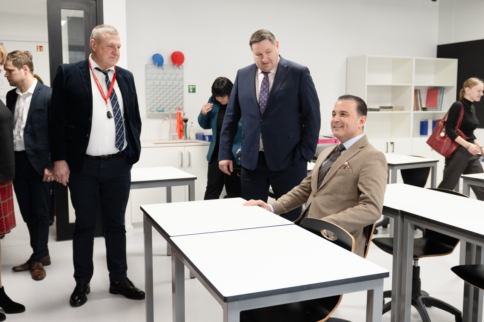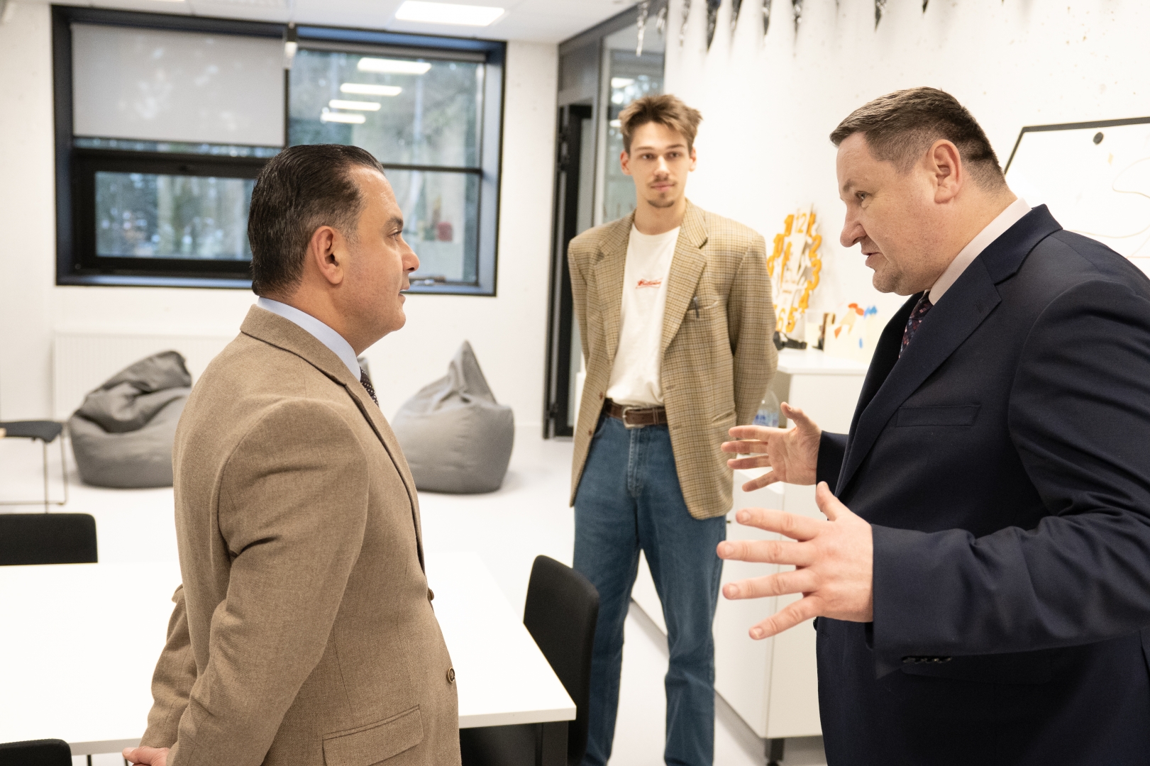 Ministrs un domes priekšsēdētājs diskutē skolēnu pašpārvaldes telpā, aiz viņiem - pašpārvaldes prezidents
