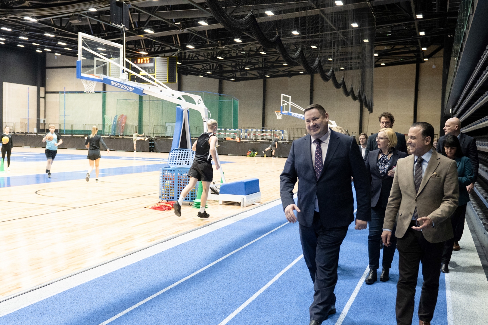 Tikšanās dalībnieki iet pa sporta arēnas skrejceļu
