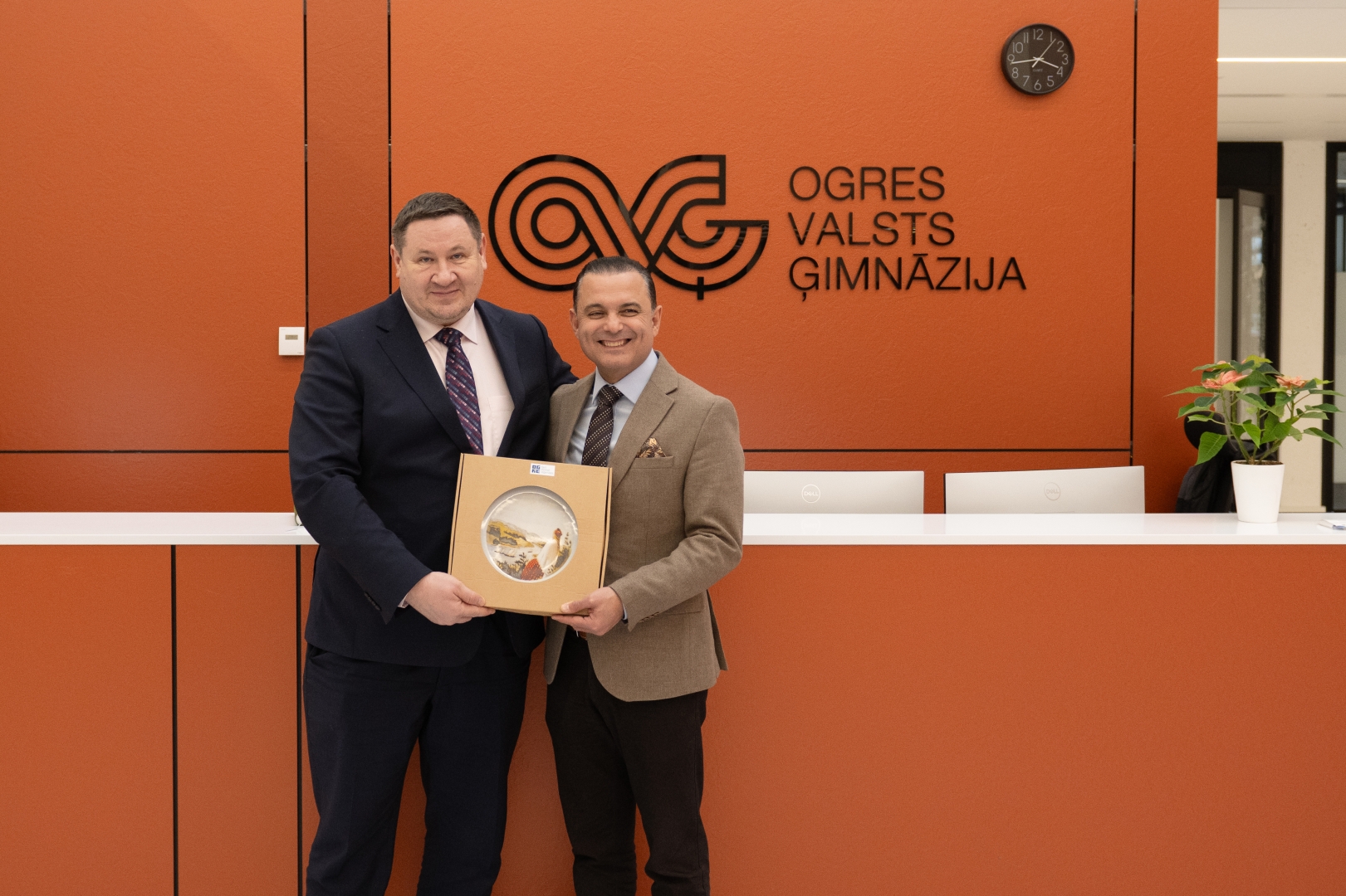 Ministrs un domes priekšsēdētājs pie Ogres Valsts ģimnāzijas logo, kas izvietots uz oranžas sienas