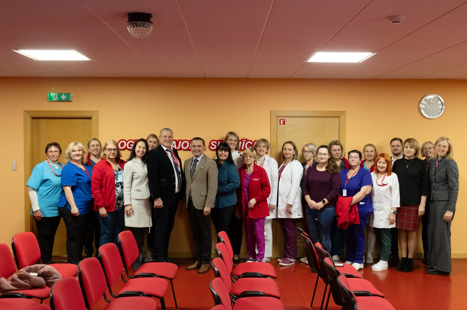 Vizītes dalībniekiem un slimnīcas personāla kopbilde konferenču telpā