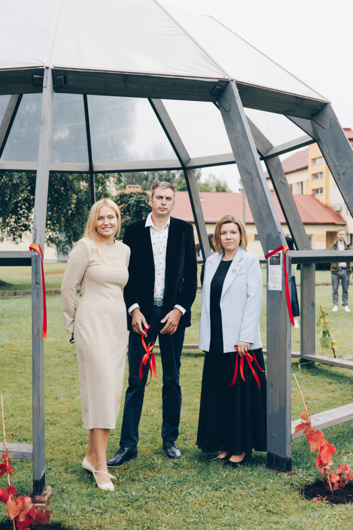 Ķeguma pamatskolā atklāta “zaļā klase” – jauna āra telpa skolēniem un kopienai. Tiek griezta atklāšanas lentīte