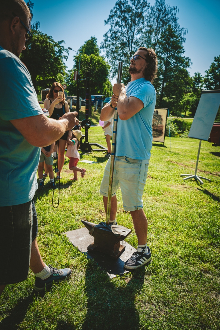 Vīrietis zilā kreklā ceļ svara bumbu  Ķegumā 25.05.2024.