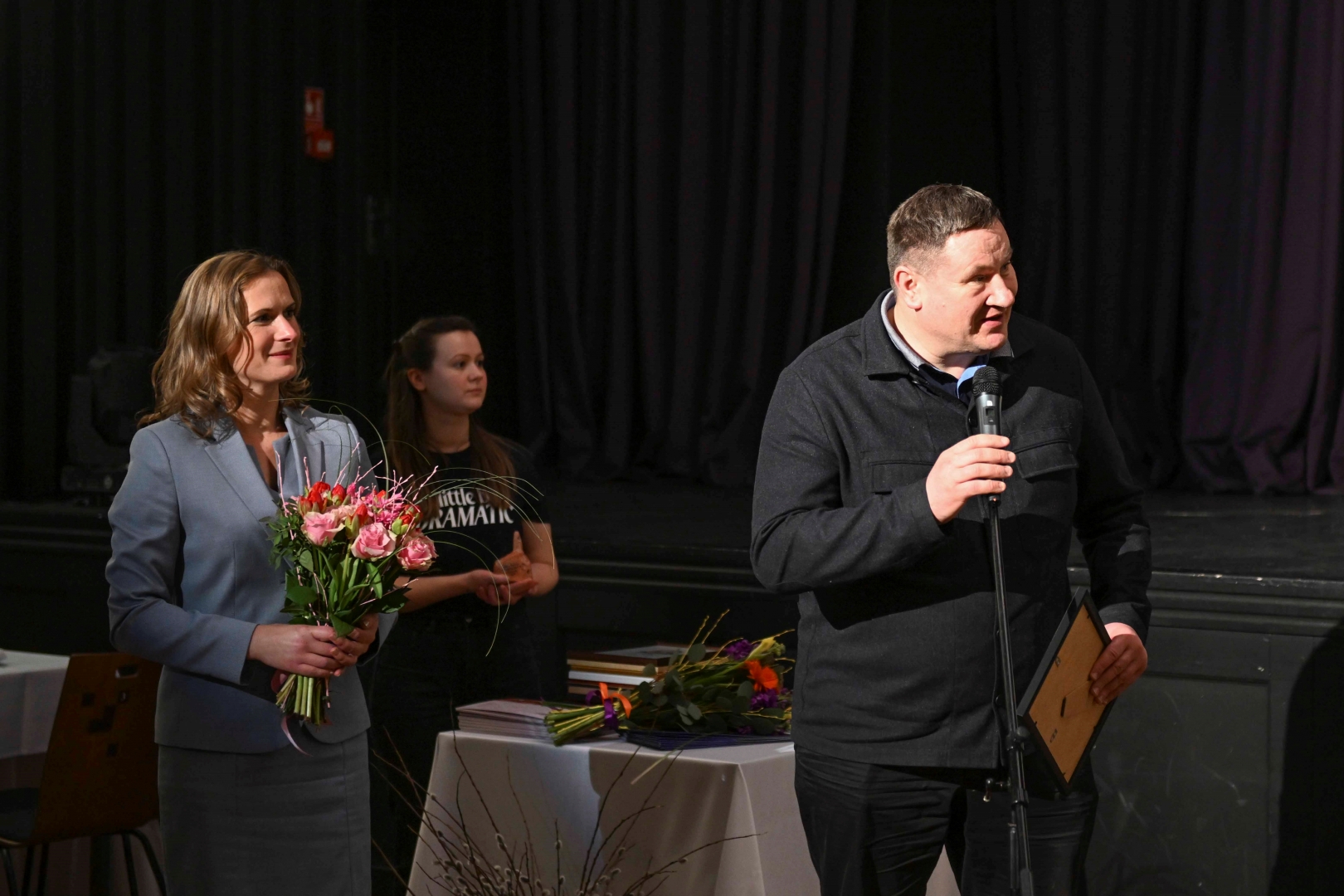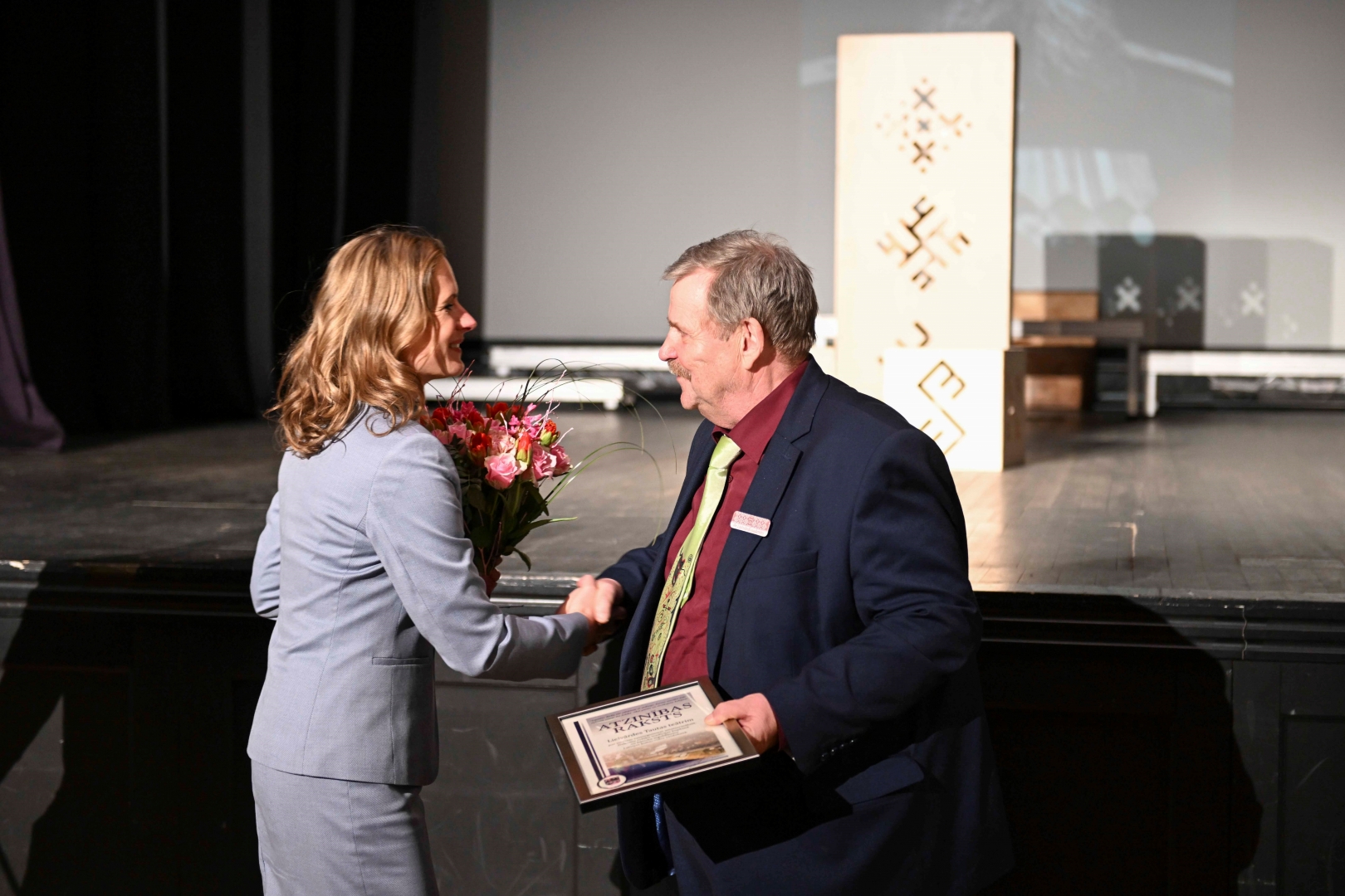 Kultūras un tūrisma pārvaldes vadītāja Marika Zeimule sveic Lielvārdes teātra režisoru režisoru Kārli Lišmani