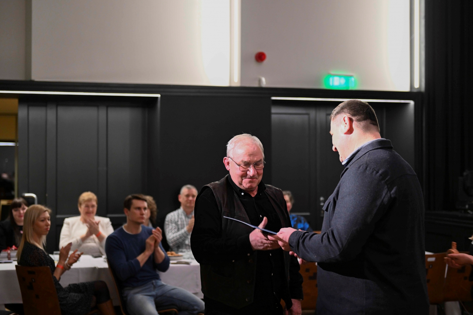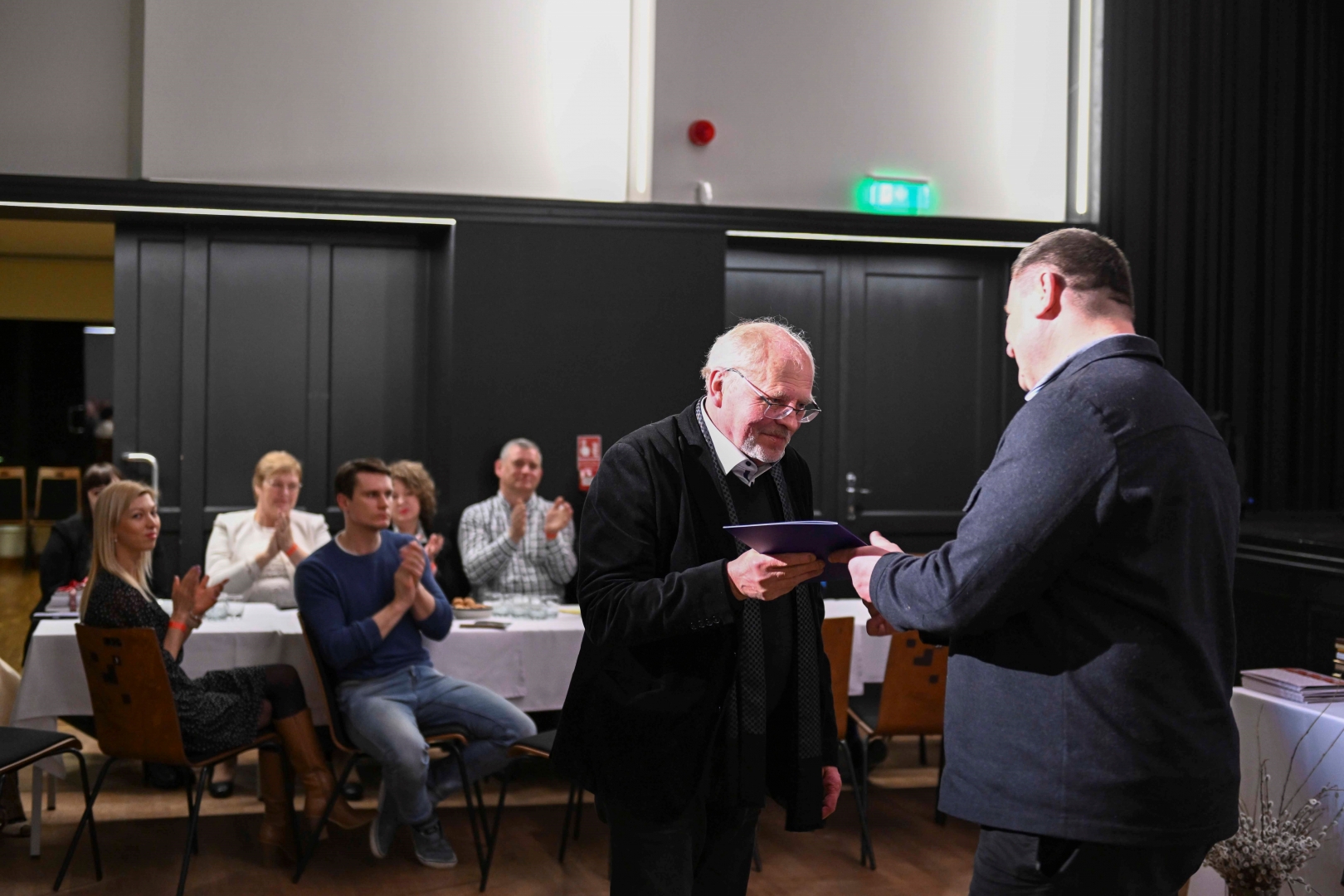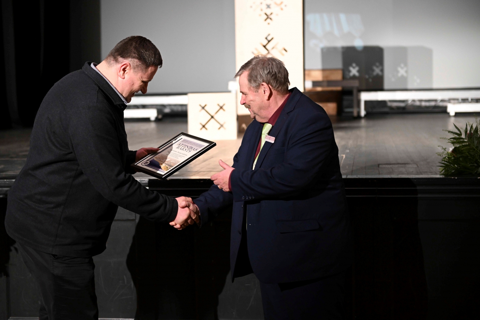 Domes priekšsēdētājs Egils Helmanis pasniedz pateicību Ogres teātra režisoram Jānim Kaijakam