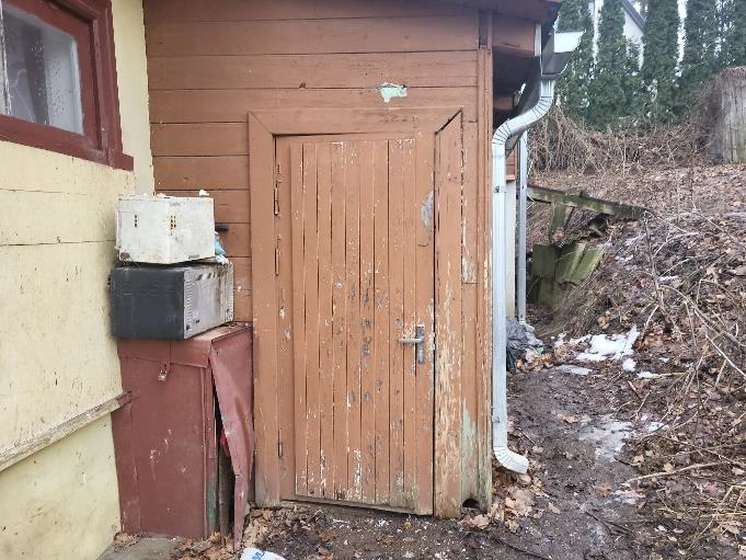 Istaba, gaiši brūnas, nopelējušas sienas, skapītis, durvis