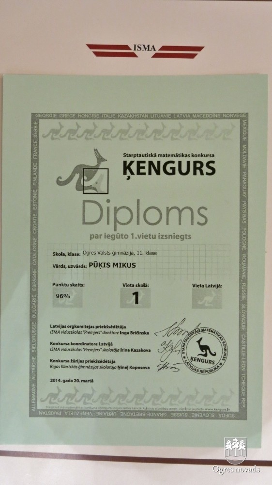 Ogres Valsts ģimnāzijas skolēniem augsti rezultāti matemātikas un ZPD konkursā
