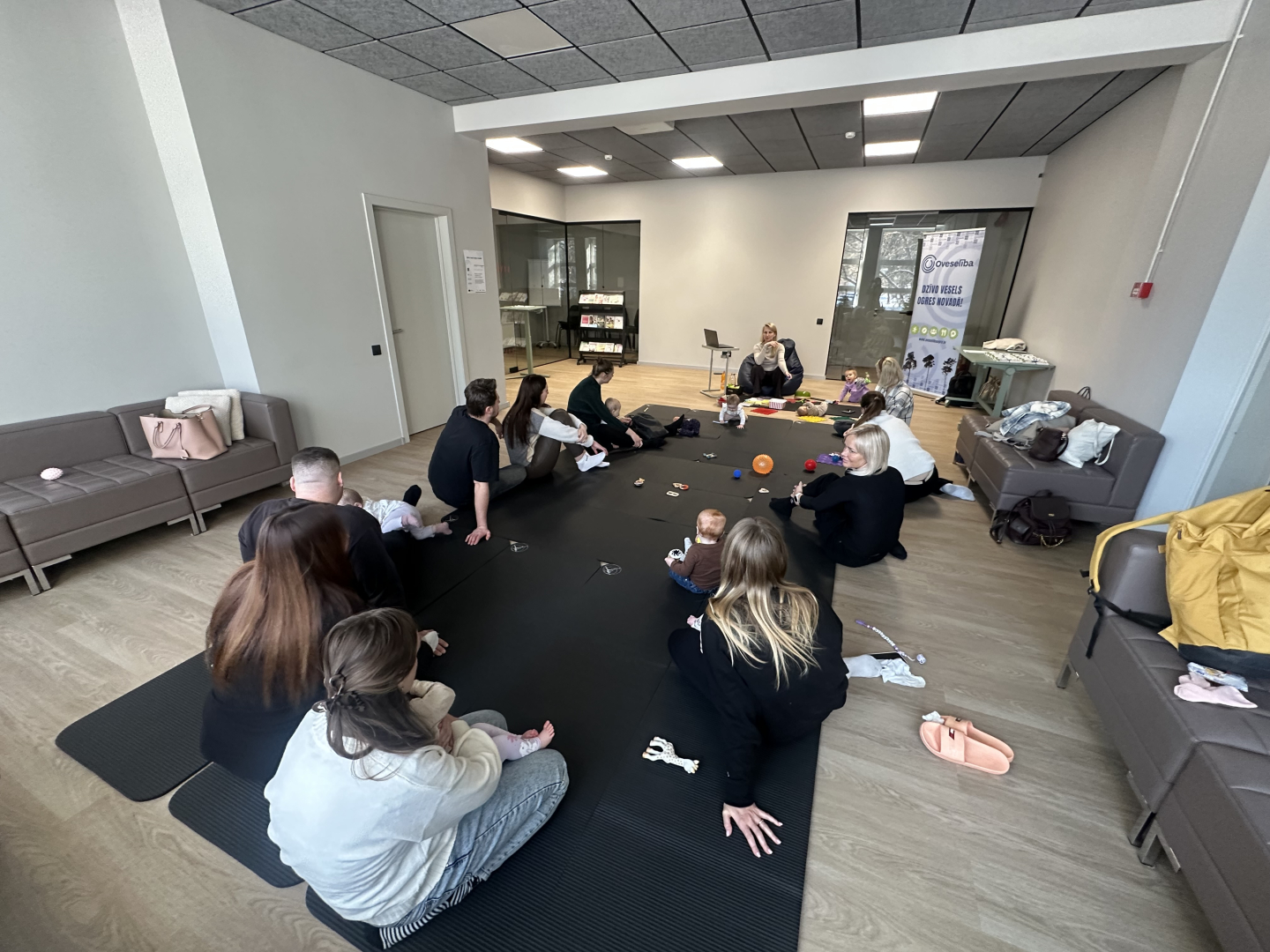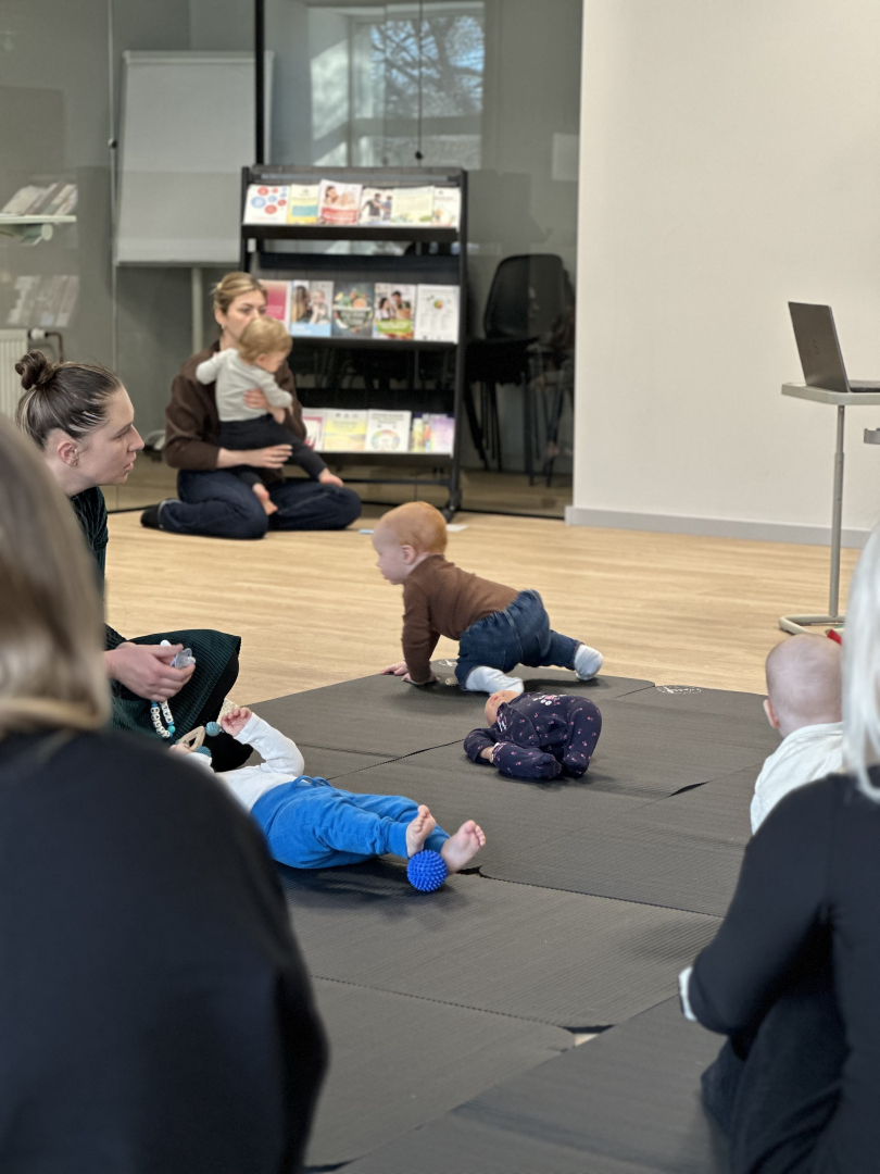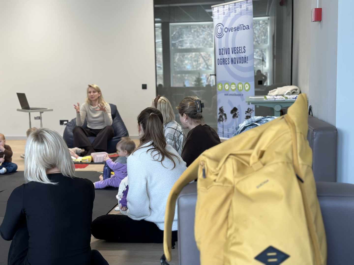 Oveselība telpās aizvadīta izzinoša un praktiska nodarbība vecākiem par sīkās motorikas attīstību mazuļa pirmajā dzīves gadā