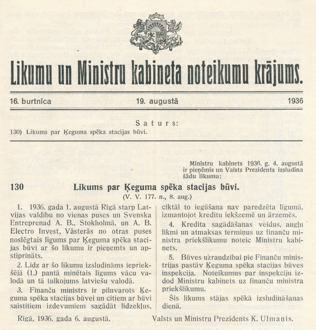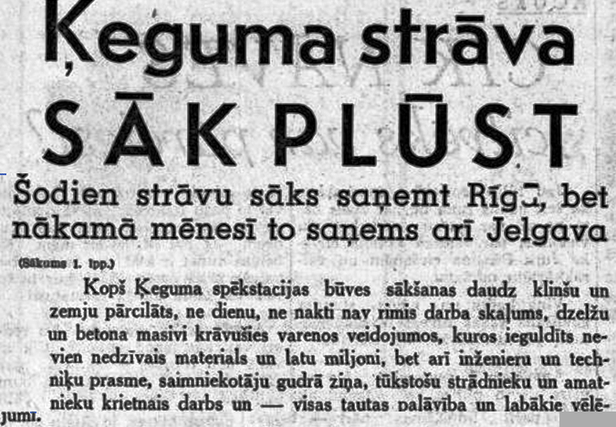 Rīga pirms 85 gadiem pirmo reizi saņēma Ķeguma HES ražoto elektrību