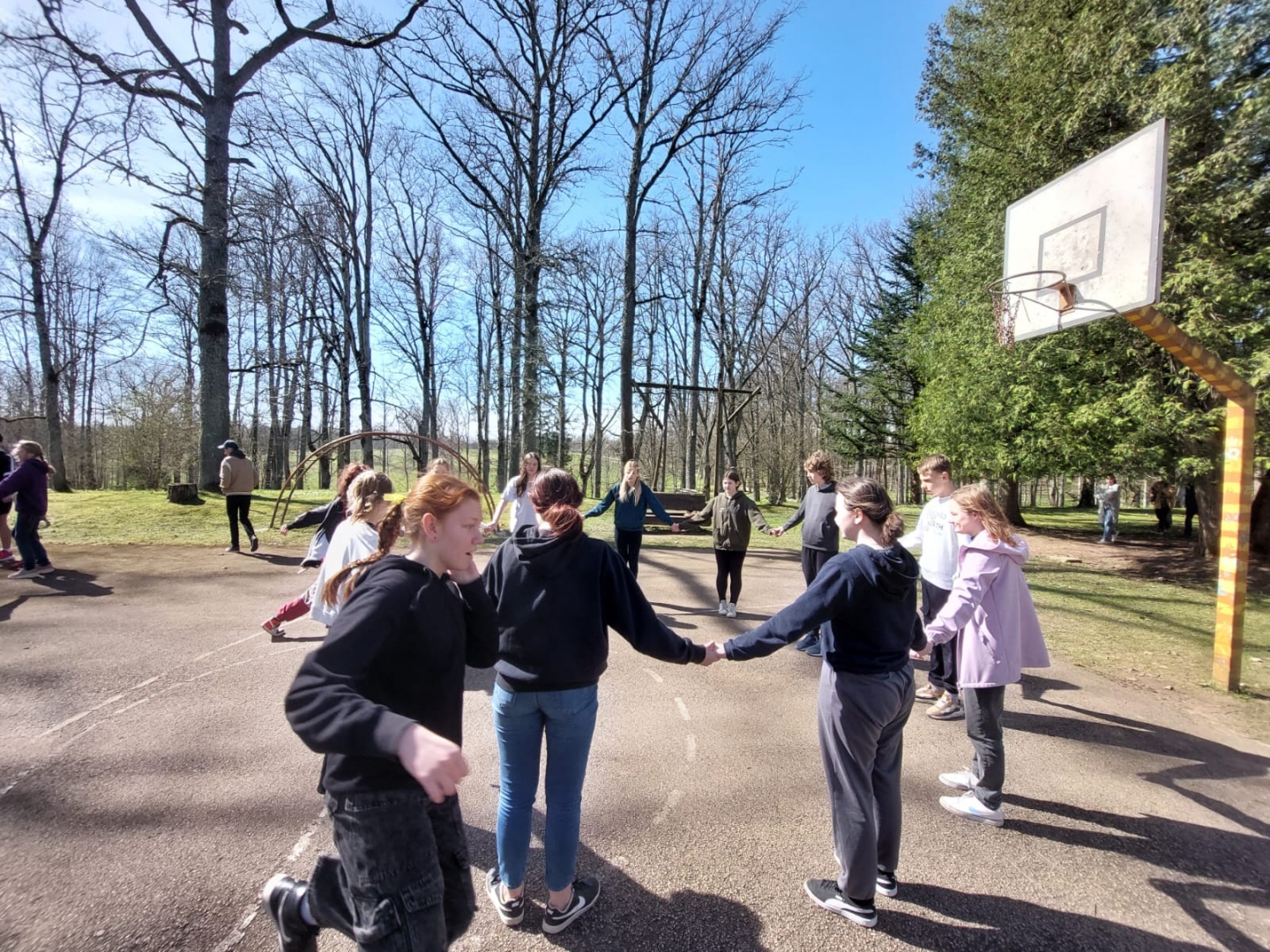 Jaunieši skrien pie Taurupes pamatskolas, fonā basketbola grozs
