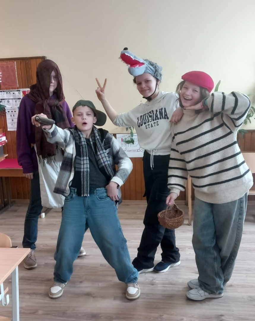 4 jaunieši saģērbušies dīvainos tērpos