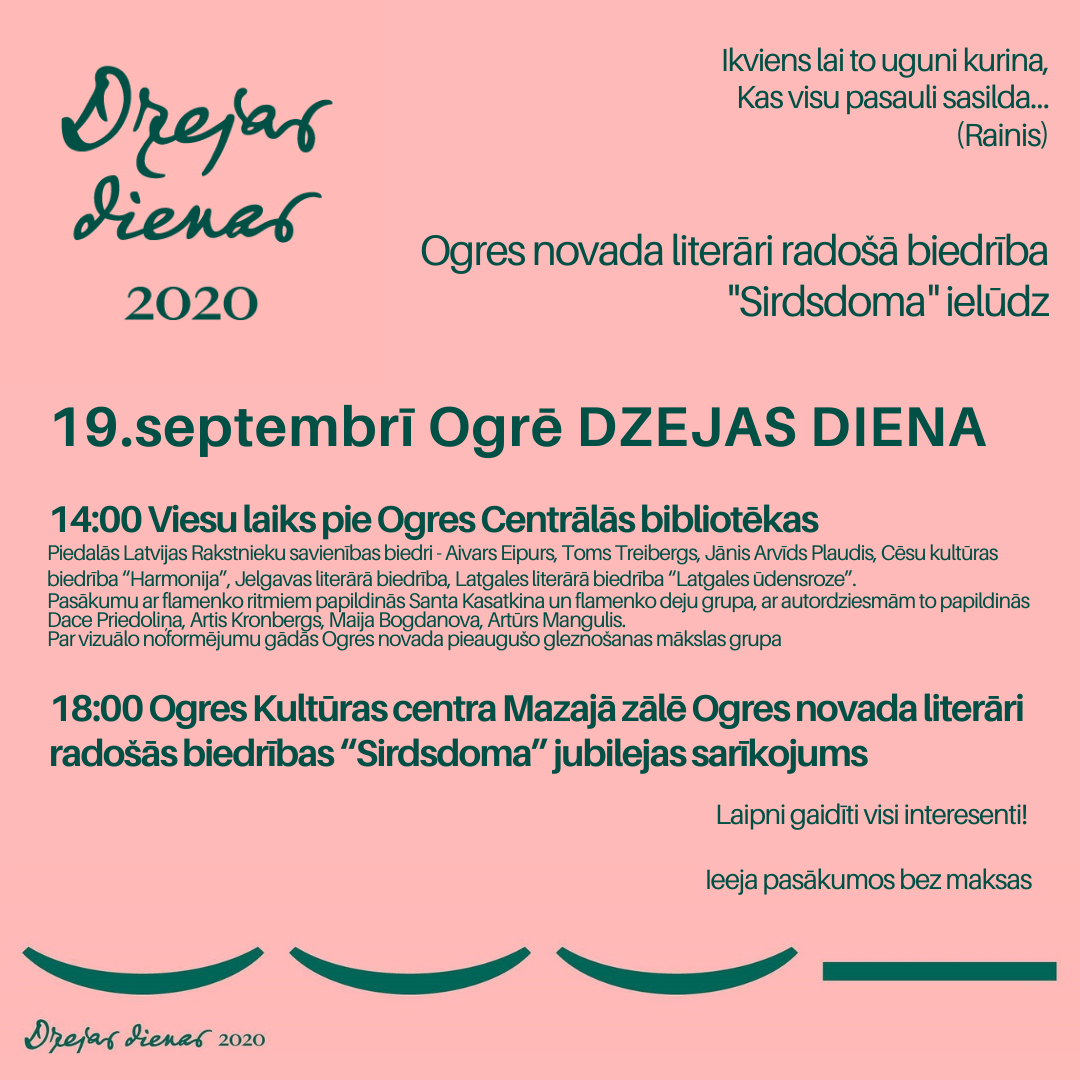 Plkst. 18.00 Ogres Kultūras centra Mazajā zālē Ogres novada literāri radošās biedrības “Sirdsdoma” jubilejas sarīkojums.