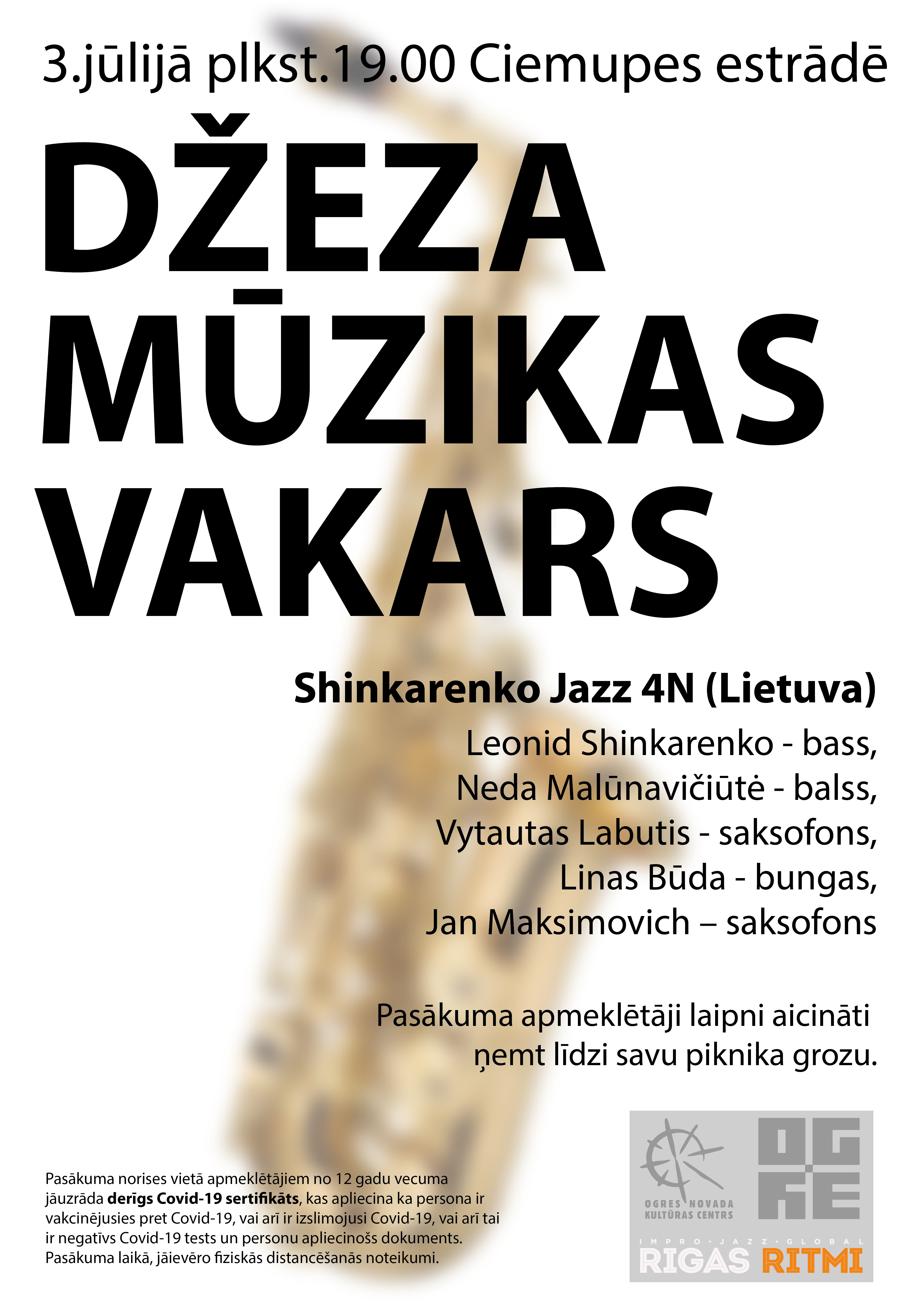 Lai piedalītos DŽEZA MŪZIKAS VAKRĀ, ievērojot valstī noteiktos epidemioloģiskos noteikumus, ierodoties pasākuma norises vietā, apmeklētājiem no 12 gadu vecuma jāuzrāda digitālais Covid-19 sertifikāts, kas apliecina, ka persona ir vakcinējusies, izslimojusi vai arī veikusi testu. Apmeklētājiem jāuzrada personu apliecinošs dokuments.