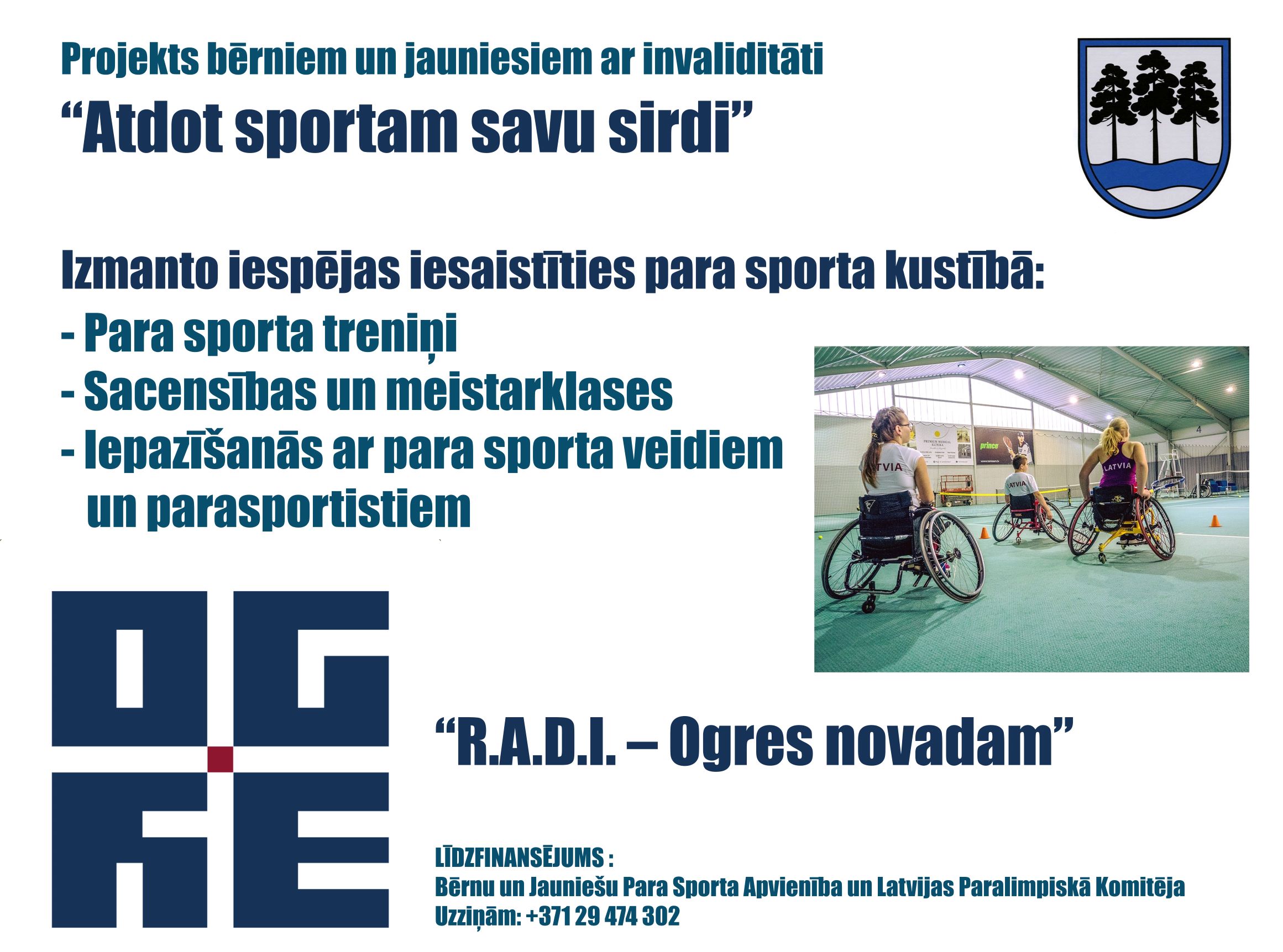 Biedrība “Bērnu un Jauniešu Para Sporta Apvienība” Ogrē uzsākusi jaunu projektu “Atdot sportam savu sirdi”, kuru atbalsta Ogres novada pašvaldība projektu konkursa “R.A.D.I. – Ogres novadam” ietvaros un līdzfinansē biedrība “Bērnu un Jauniešu Para Sporta Apvienība” un Latvijas Paralimpiskā komiteja.