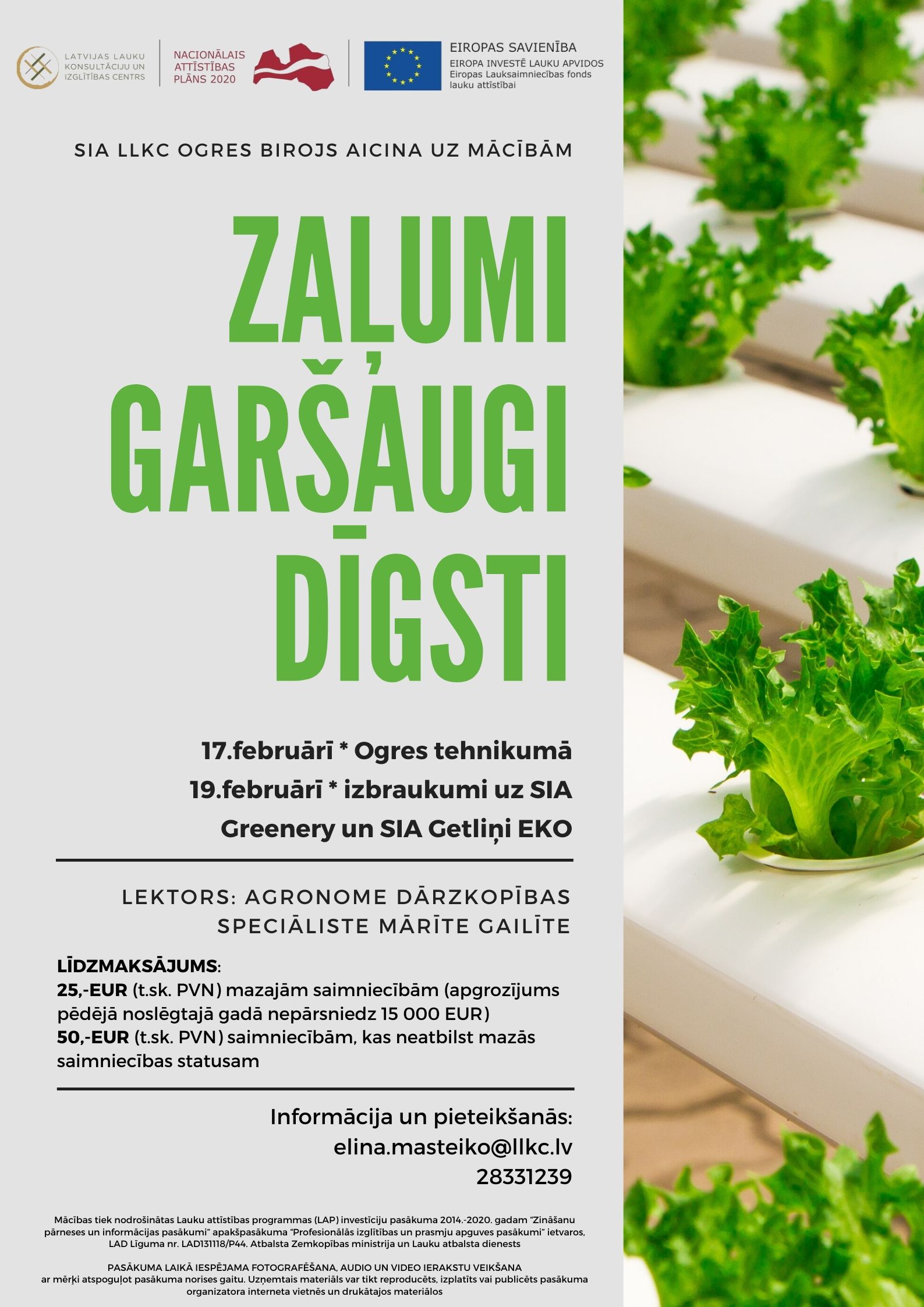 Mācības tiek nodrošinātas Lauku attīstības programmas (LAP) investīciju pasākuma 2014.-2020. gadam “Zināšanu pārneses un informācijas pasākumi” apakšpasākuma “Profesionālās izglītības un prasmju apguves pasākumi” ietvaros, LAD Līguma nr. LAD131118/P44. Atbalsta Zemkopības ministrija un Lauku atbalsta dienests