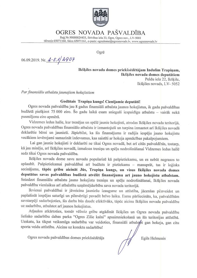 Sēdes informatīvajā daļā E. Helmanis aicināja Ikšķiles novada pašvaldību “atvērt durvis, pie kurām jau labu laiku klauvē Ogres novads”, un aktualizēja jautājumu par iespējām, kā veicināt jauno hokejistu izaugsmi. Jau pērn 2019. gada 6. septembrī Ogres novada pašvaldība lūdza Ikšķiles novada pašvaldību pārskatīt atbalsta iespējas jauno hokejistu prasmju attīstībai, ņemot vērā to, ka ledus hallē, kas atrodas Ikšķiles novada teritorijā, trenējas gan Ogres, gan Ikšķiles novada bērni.