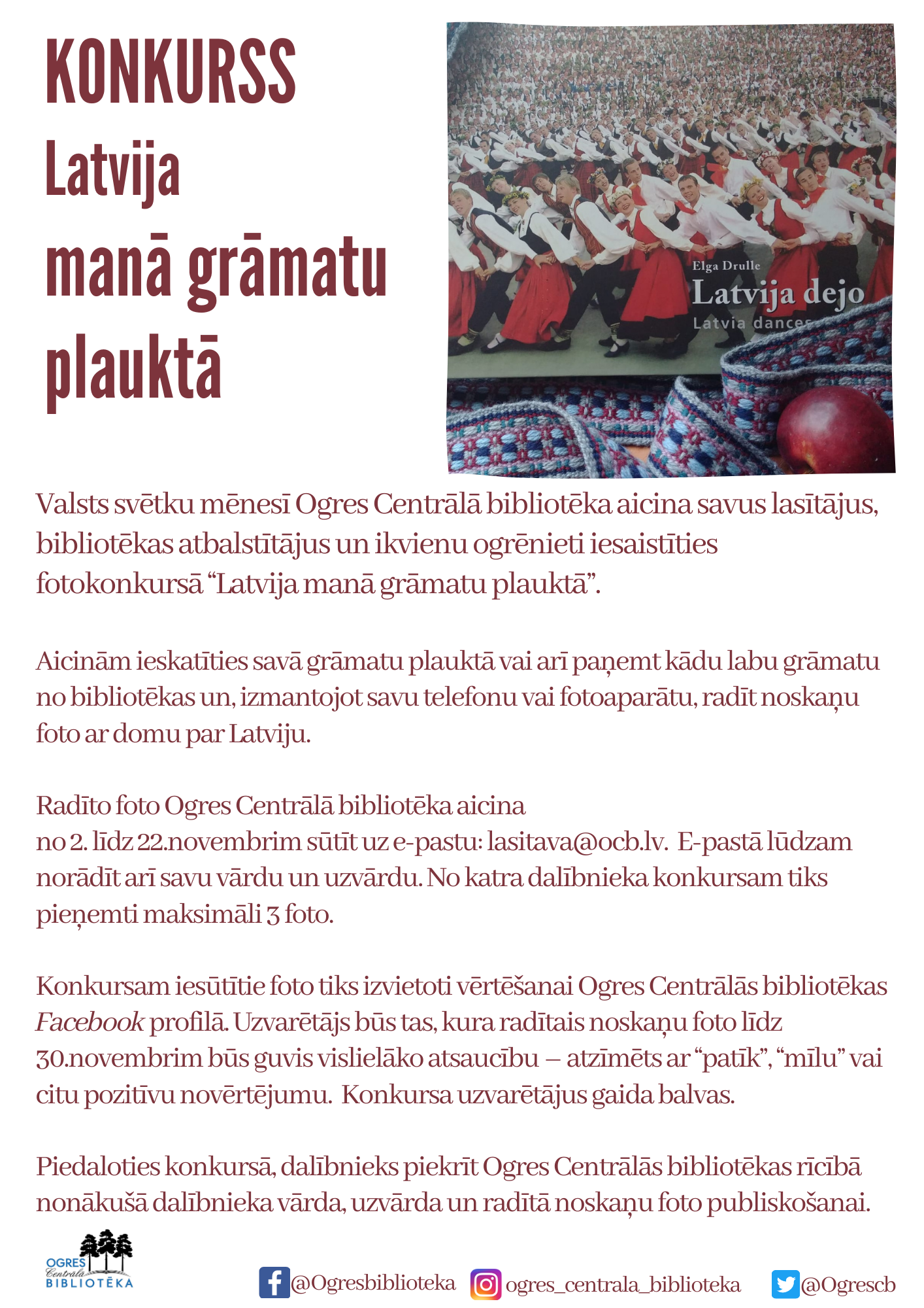 Radīto foto Ogres Centrālā bibliotēka aicina no 2. līdz 22. novembrim sūtīt uz e-pastu: lasitava@ocb.lv. E-pastā lūdzam norādīt arī savu vārdu un uzvārdu. No katra dalībnieka konkursam tiks pieņemti maksimāli 3 foto.
