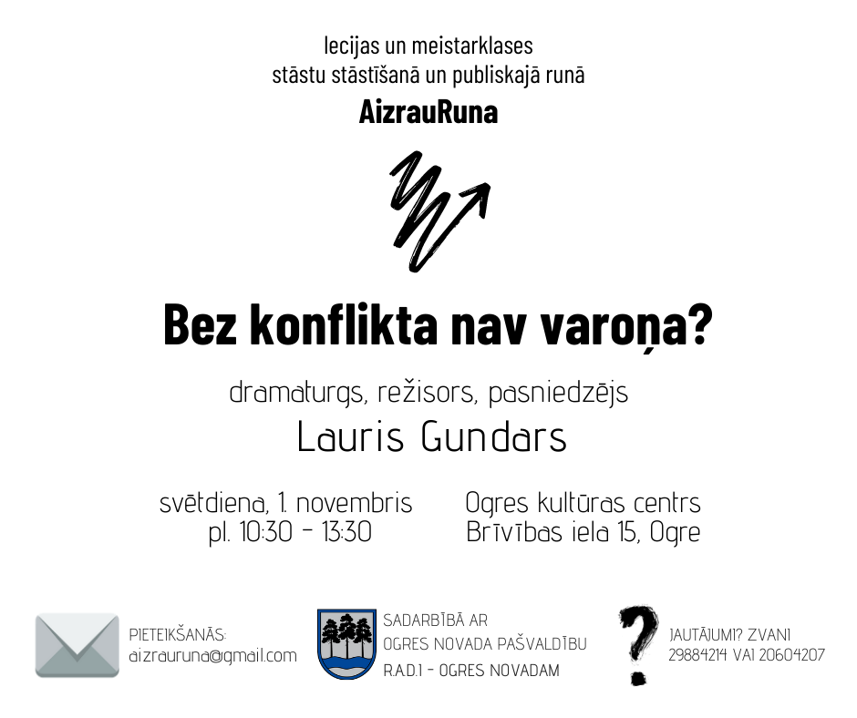 Lekciju cikla “AizrauRuna” 4. nodarbības lektors būs dramaturgs un režisors Lauris Gundars. Tikšanās laikā iesaistīsimies konfliktos un apbrīnosim paradoksus. Uzzināsim, kas dramaturģijai kopīgs ar dzīvi.