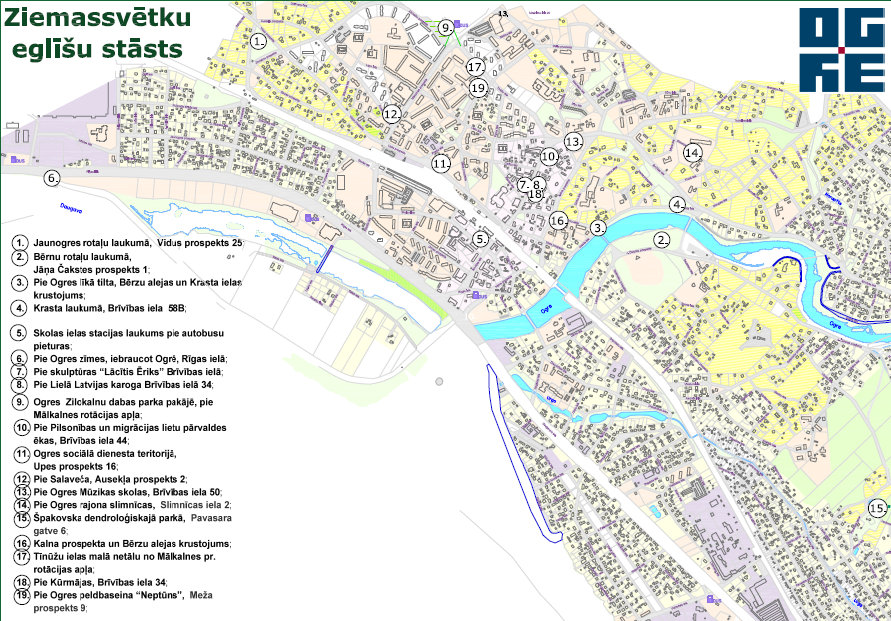Ziemassvētku eglīšu stāstu izlasīt palīdzēs Ogres pilsētas karte ar tajā iezīmētajām eglīšu atrašanās vietām.