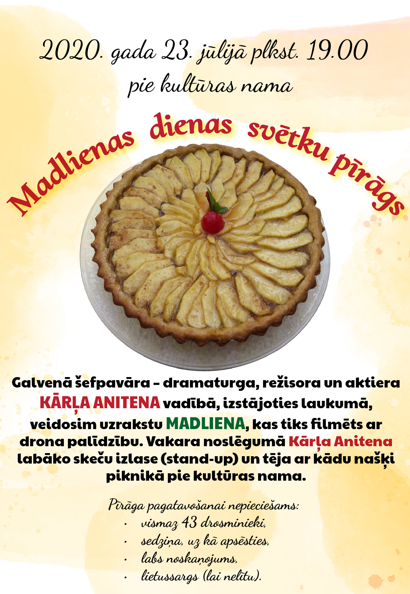 Galvenā šefpavāra – režisora, dramaturga un aktiera Kārļa Anitena vadībā visi sanākušie, izstājoties laukumā, ievērojot visus drošības pasākumus, veidos uzrakstu MADLIENA, kurš tiks filmēts ar drona palīdzību. Kamēr “pīrāgs cepsies”, pasākuma dalībniekiem būs iespēja baudīt Kārļa Anitena labākos skečus (stand-up). Vakara noslēgumā – tēja un našķi piknikā pie kultūras nama. Lai iecerētais „pīrāgs” izdotos, tā pagatavošanai ir nepieciešamas dažas būtiskas sastāvdaļas – vismaz 43 drosminieki, kuri veidos galvenos punktus katrā burtā, labs noskaņojums, sedziņa, uz kuras apsēsties, kā arī lietussargs, lai nelītu.