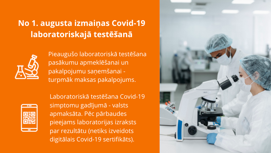 Noslēdzoties Ministru kabineta noteiktajam pārejas periodam, no 2021. gada 1. augusta stājas spēkā izmaiņas pieaugušo Covid-19 laboratoriskajā testēšanā, paredzot, ka turpmāk testēšanu pasākumu apmeklēšanai un dažādu pakalpojumu saņemšanai varēs veikt tikai par maksu, informē Nacionālais veselības dienests (NVD). Samaksa par laboratorisko testu būs jāveic atbilstoši laboratorijas maksas pakalpojumu cenrādim.