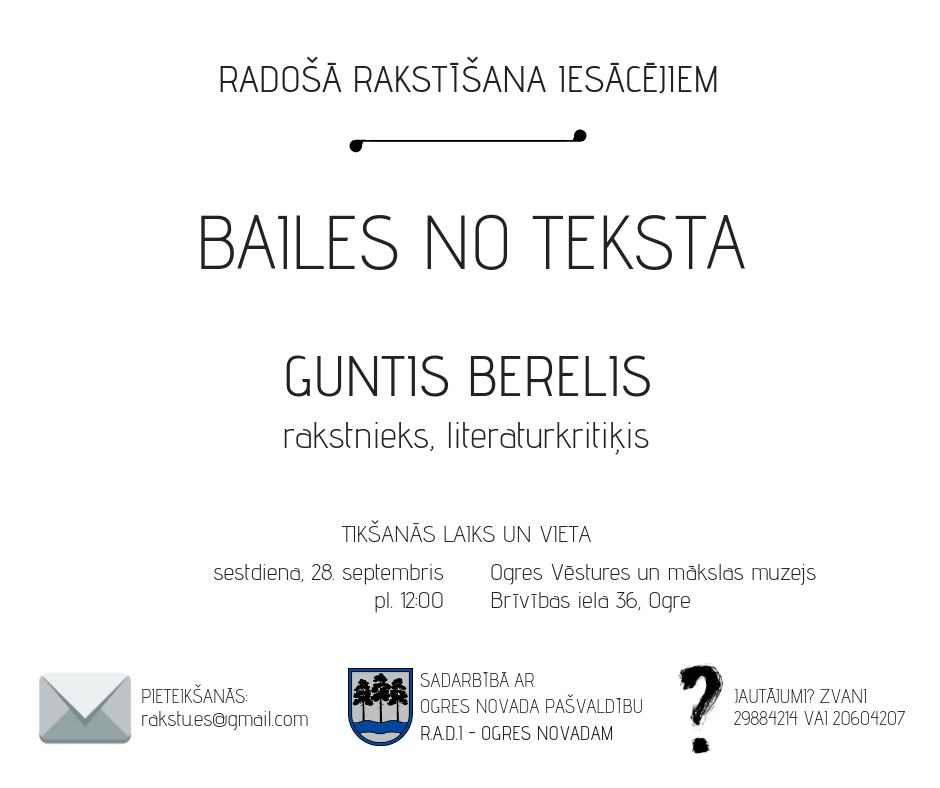Tikšanās ar G. Bereli sestdien, 28. septembrī plkst. 12.00 Ogres Vēstures un mākslas muzejā Brīvības ielā 36. Pieteikšanās rakstu.es@gmail.com. Nodarbības aicinām apmeklēt arī jaunus interesentus, kuri līdz šim nav piedalījušies lekcijās.