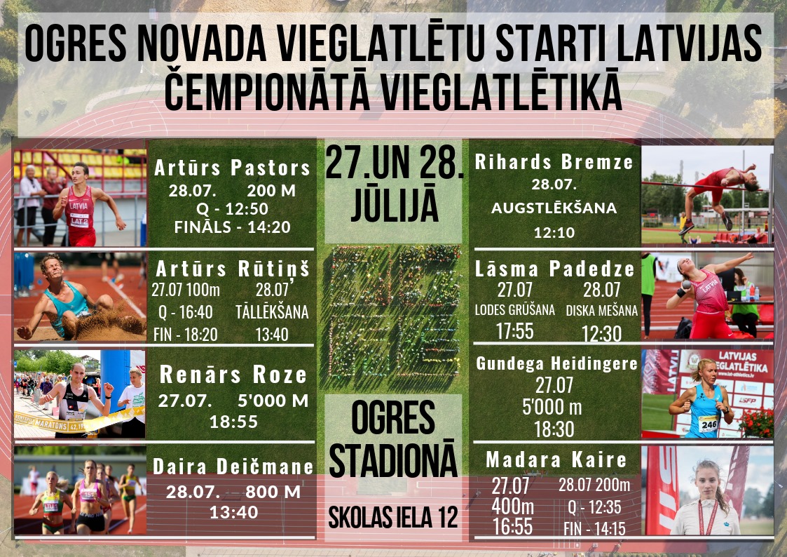 Vietējie vieglatlētikas līdzjutēji ar īpašu interesi varēs sekot līdzi vairāku Ogres sportistu startiem. Mūsu pilsētu Latvijas čempionātā pārstāvēs: Artūrs Pastors (200 m), Artūrs Rūtiņš (100 m, tāllēkšana), Renārs Roze (5000 m), Daira Deičmane (800 m), Rihards Bremze (augstlēkšana), Lāsma Padedze (lodes grūšana, diska mešana), Gundega Heidingere (5000 m), Madara Kaire (400 m, 200 m).