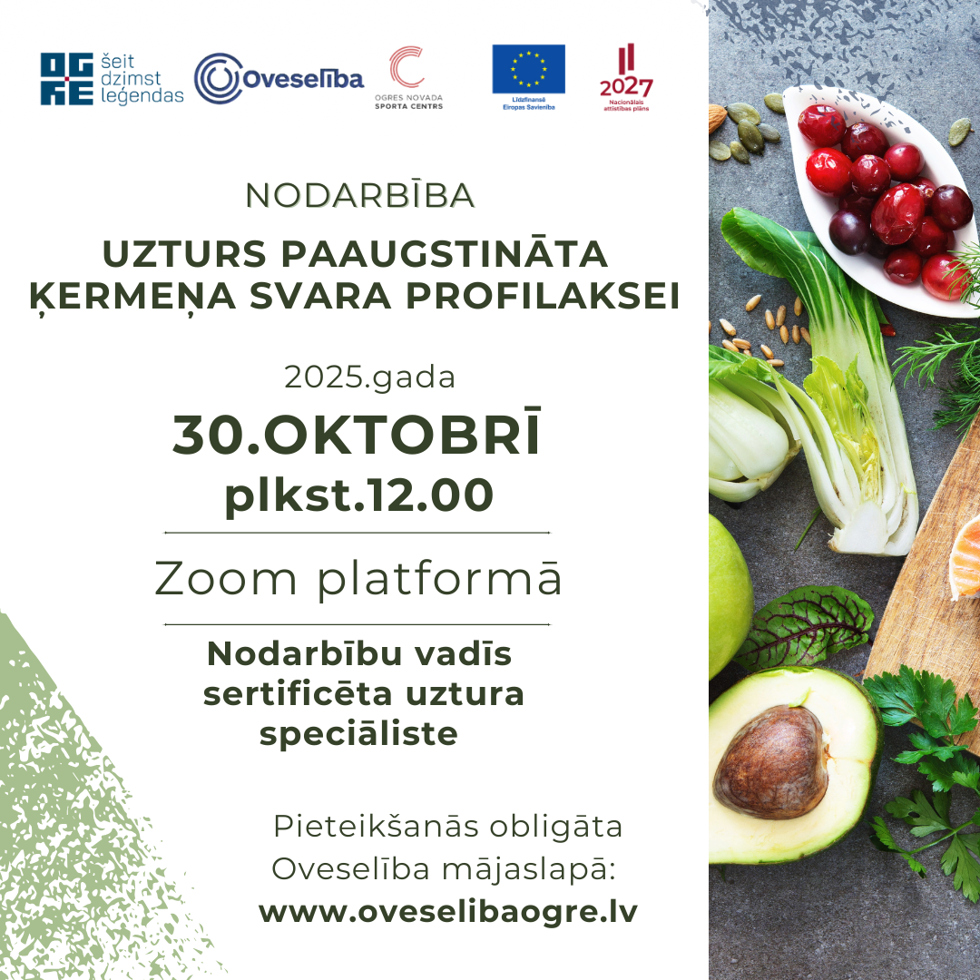 Oveselība aicina uz izglītojošu nodarbību par uzturu paaugstināta ķermeņa svara profilaksei 2025.gada 30.oktobrī plkst.12.00, attālināti tiešsaistē – Zoom platformā.