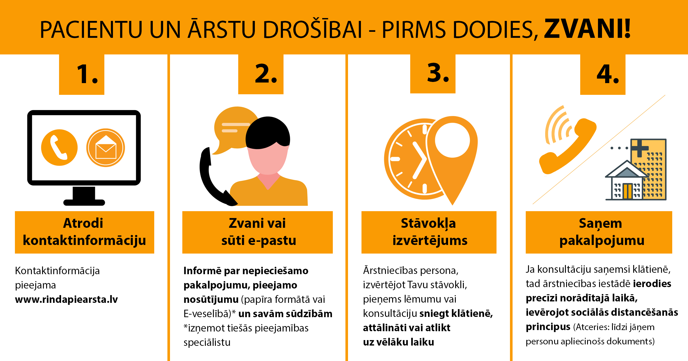 Iedzīvotāji tiek aicināti pirms došanās saņemt veselības aprūpes pakalpojumu sazināties ar ārstniecības iestādi par pakalpojuma saņemšanas kārtību. Zvanot vai sūtot e-pastu, jānorāda nepieciešamais pakalpojums, pieejamais nosūtījumus (papīra formātā vai E-veselības portālā) un jāinformē par savām sūdzībām. Ārstniecības iestāde, izvērtējot pacienta stāvokli, pieņems lēmumu vai sniegt pakalpojumu klātienē, vai nodrošināt attālinātu konsultāciju, vai pakalpojuma saņemšanu atlikt uz vēlāku laiku.