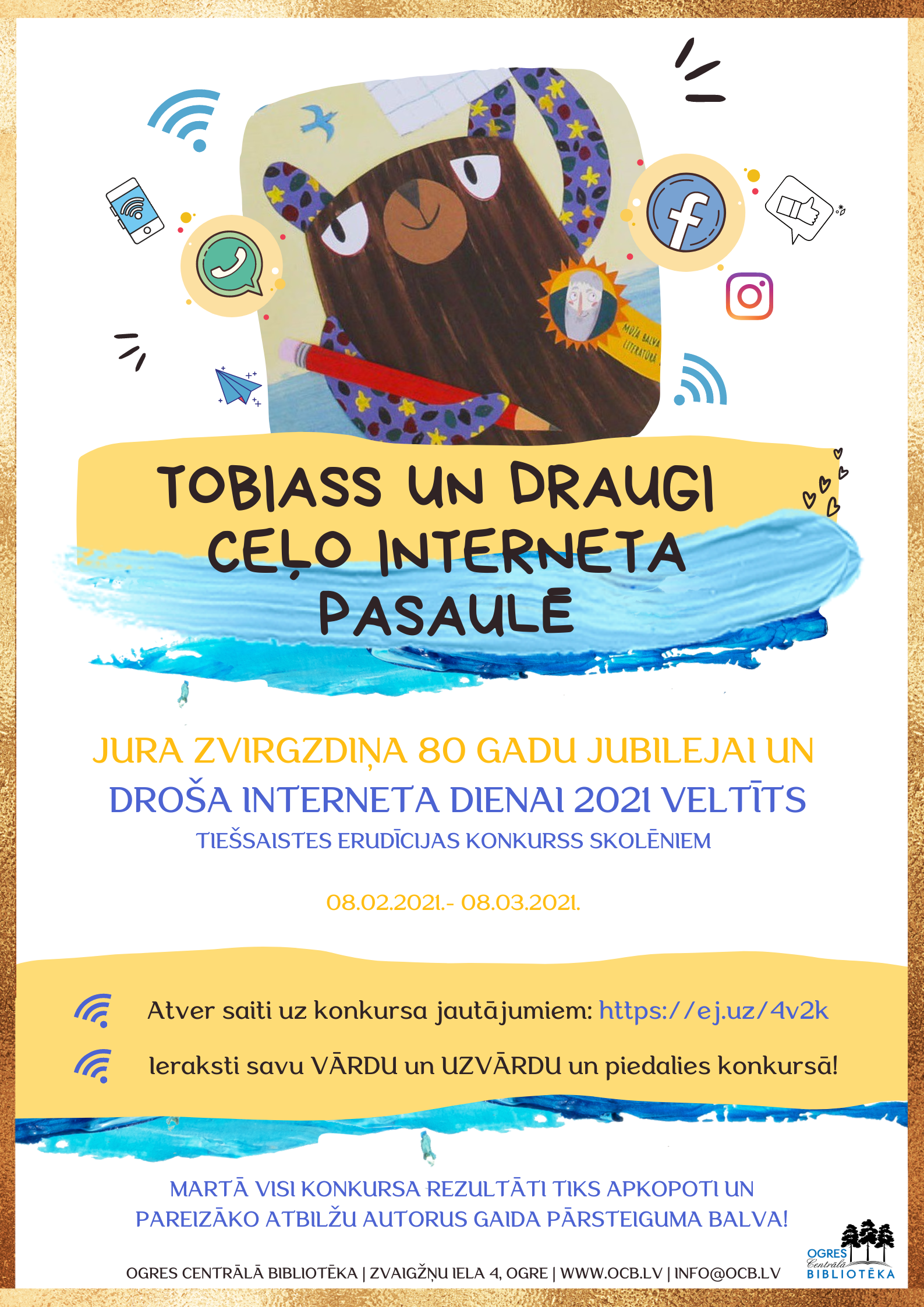 Ogres Centrālās bibliotēkas darbinieki aicina bērnus ceļot kopā ar slaveno Jura Zvirgzdiņa grāmatu varoni lācēnu Tobiasu plašajā interneta pasaulē un, atverot saiti https://ej.uz/4v2k, ierakstot savu vārdu un uzvārdu, atbildēt uz tiešsaistes erudīcijas konkursa “Tobiass un draugi ceļo interneta pasaulē” jautājumiem un pārliecināties, vai atbilstošā situācijā zinātu, kā rīkoties.