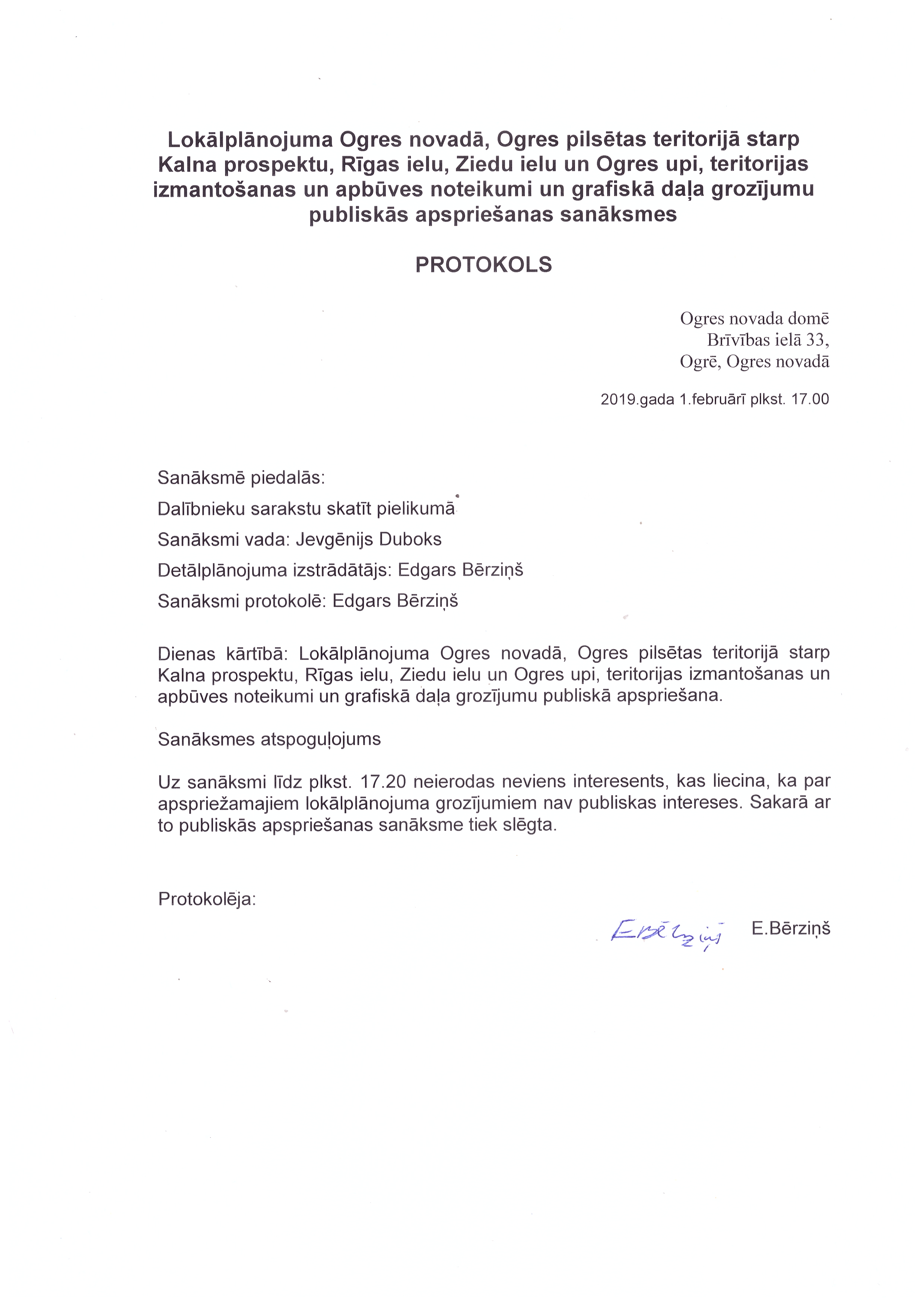 Sanāksme par Lokālplānojuma grozījumu 1.0.redakcijas risinājumiem notiks 2019. gada 1. februārī plkst. 17.00 Ogres novada pašvaldības ēkas 3. stāva zālē Brīvības ielā 33, Ogrē, Ogres nov. Šajā sanāksmē piedalīsies lokālplānojuma grozījumu autors SIA “Arhitekta Edgara Bērziņa birojs”.