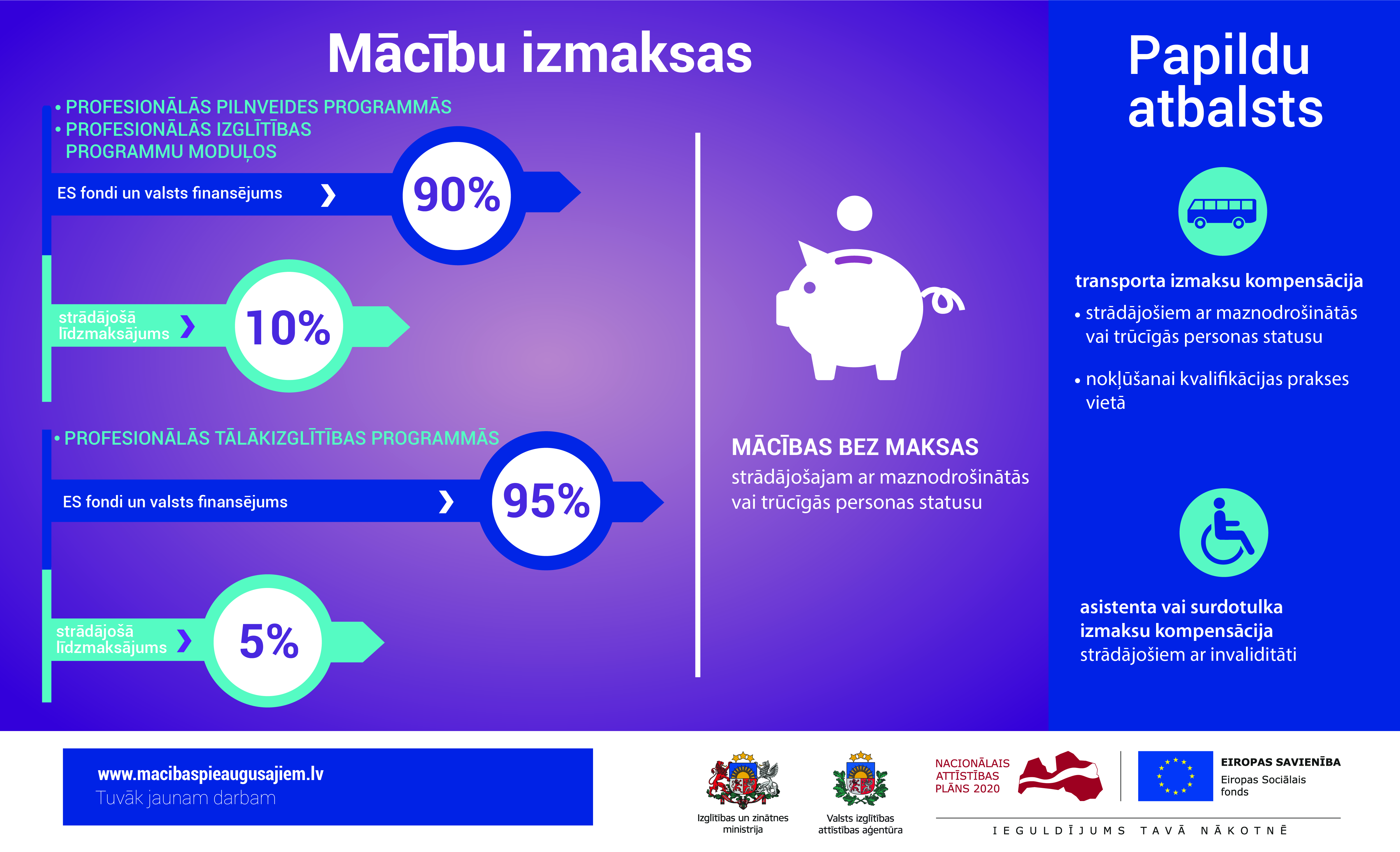 Sākot ar piekto pieteikšanās kārtu ir mainījušies līdzfinansējuma nosacījumi un, apgūstot kādu no profesionālās tālākizglītības programmām, kuru noslēgumā var iegūt profesiju, iedzīvotājiem būs jāmaksā tikai 5% līdzmaksājums, jo 95% sedz ES fondi un valsts. Turklāt pēc programmas apgūšanas iedzīvotājs varēs saņemt arī ceļa izdevumu kompensāciju līdz 30 eiro mēnesī, kas iztērēti, dodoties uz prakses vietu un atpakaļ. Pārējo izglītības programmu veidos iedzīvotāju līdzfinansējuma apjoms paliek nemainīgi 10%, ES fondu un valsts – 90%. Maznodrošinātajiem un trūcīgajiem mācības ir bez maksas, savukārt strādājošie ar invaliditāti var pretendēt uz asistenta vai surdotulka izmaksu kompensāciju mācību laikā.