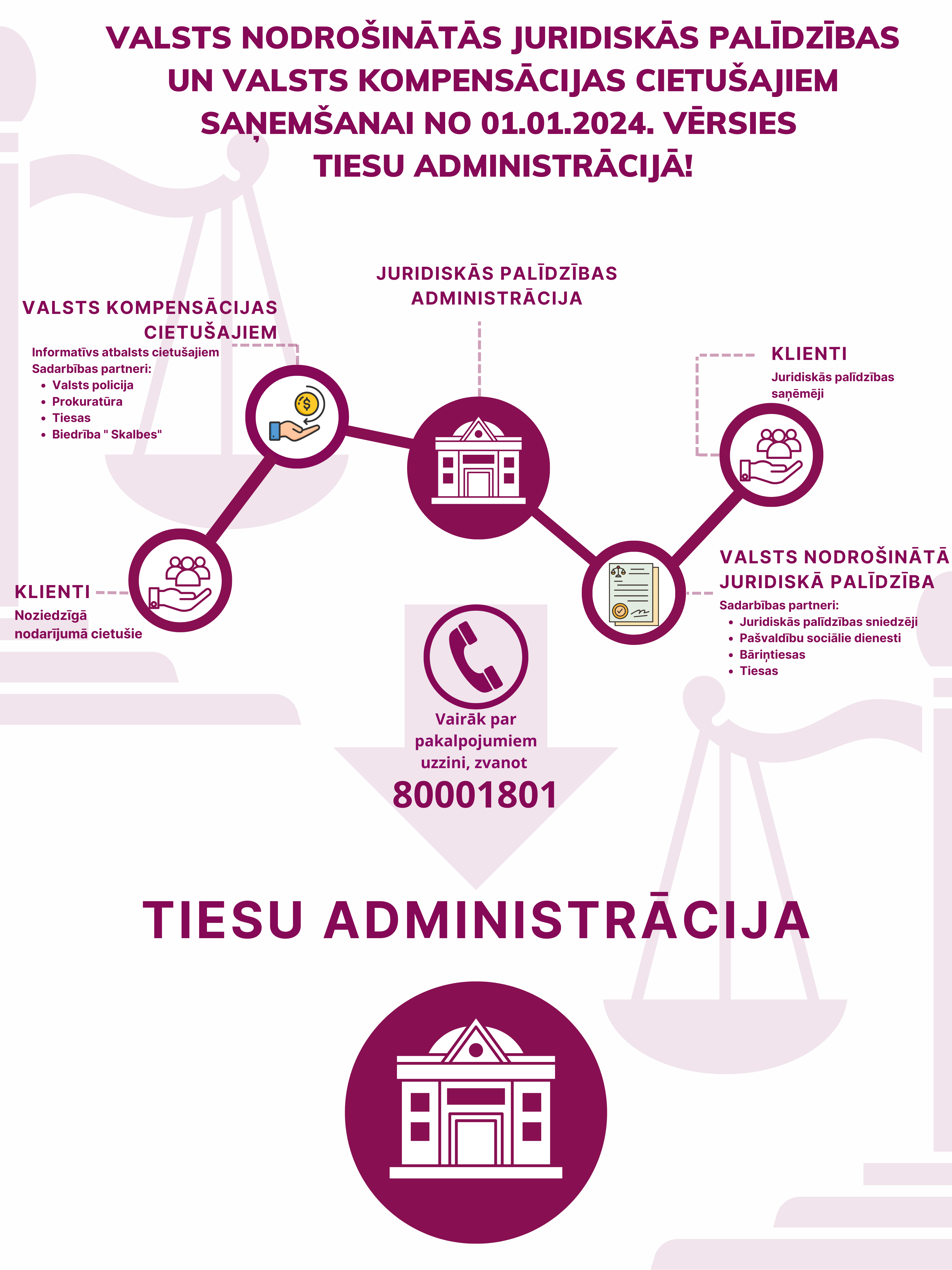 Uzzini vairāk par pakalpojumiem, iesnieguma veidlapām un informāciju par to aizpildīšanu un nepieciešamajiem dokumentiem, zvanot uz bezmaksas informatīvo tālruni 800 01 801 (darba laikā), vai apmeklē Tiesu administrācijas tīmekļa vietni www.ta.gov.lv