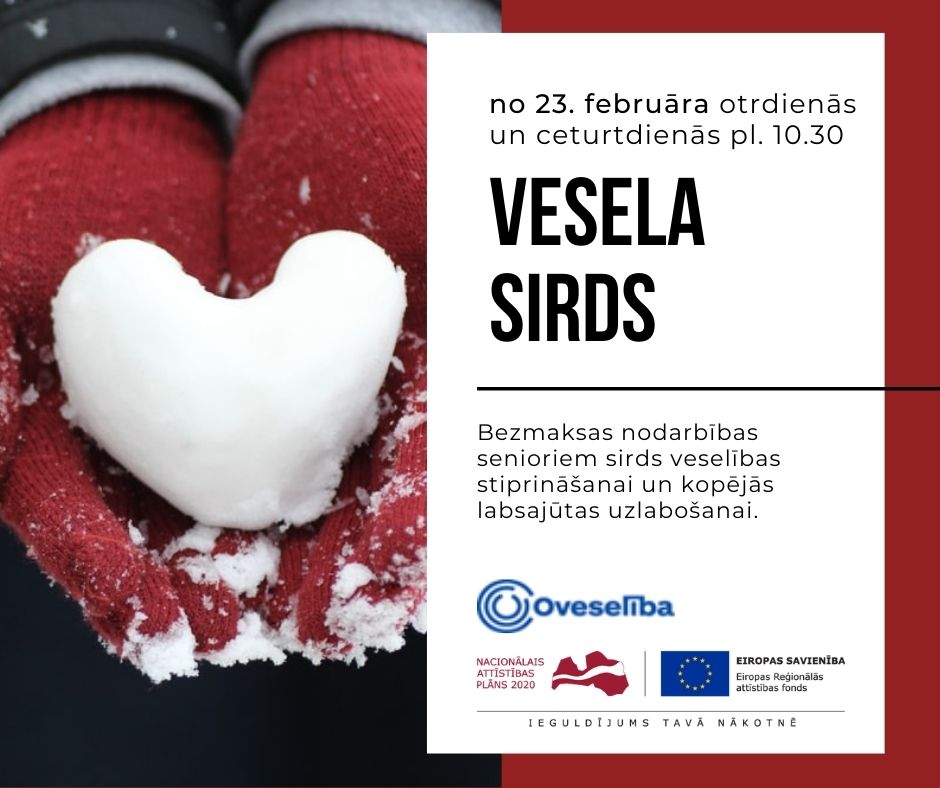 Vingrošanas nodarbību ciklu “Vesela sirds” veidos sešas nodarbības (katras nodarbības ilgums ir 60 minūtes). Tās notiks otrdienās un ceturtdienās plkst. 10.30, sākot no 23. februāra.