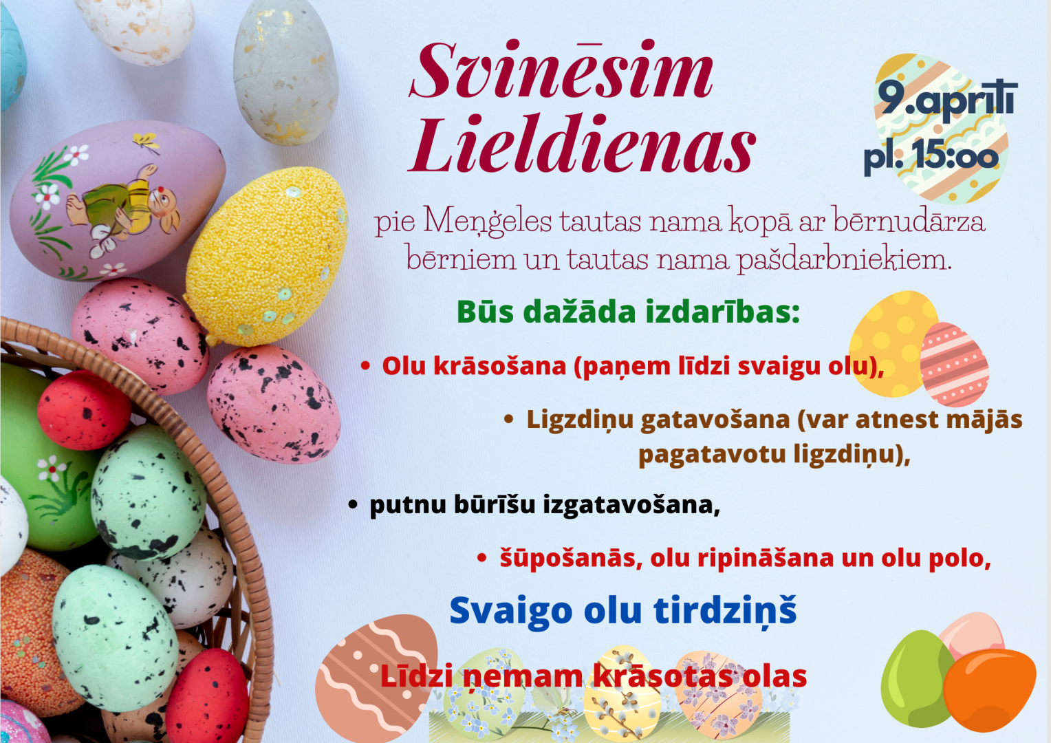 9.aprīlī plkst.15.00 Lieldienu pasākumi Meņģelē, pie Meņģeles Tautas nama.